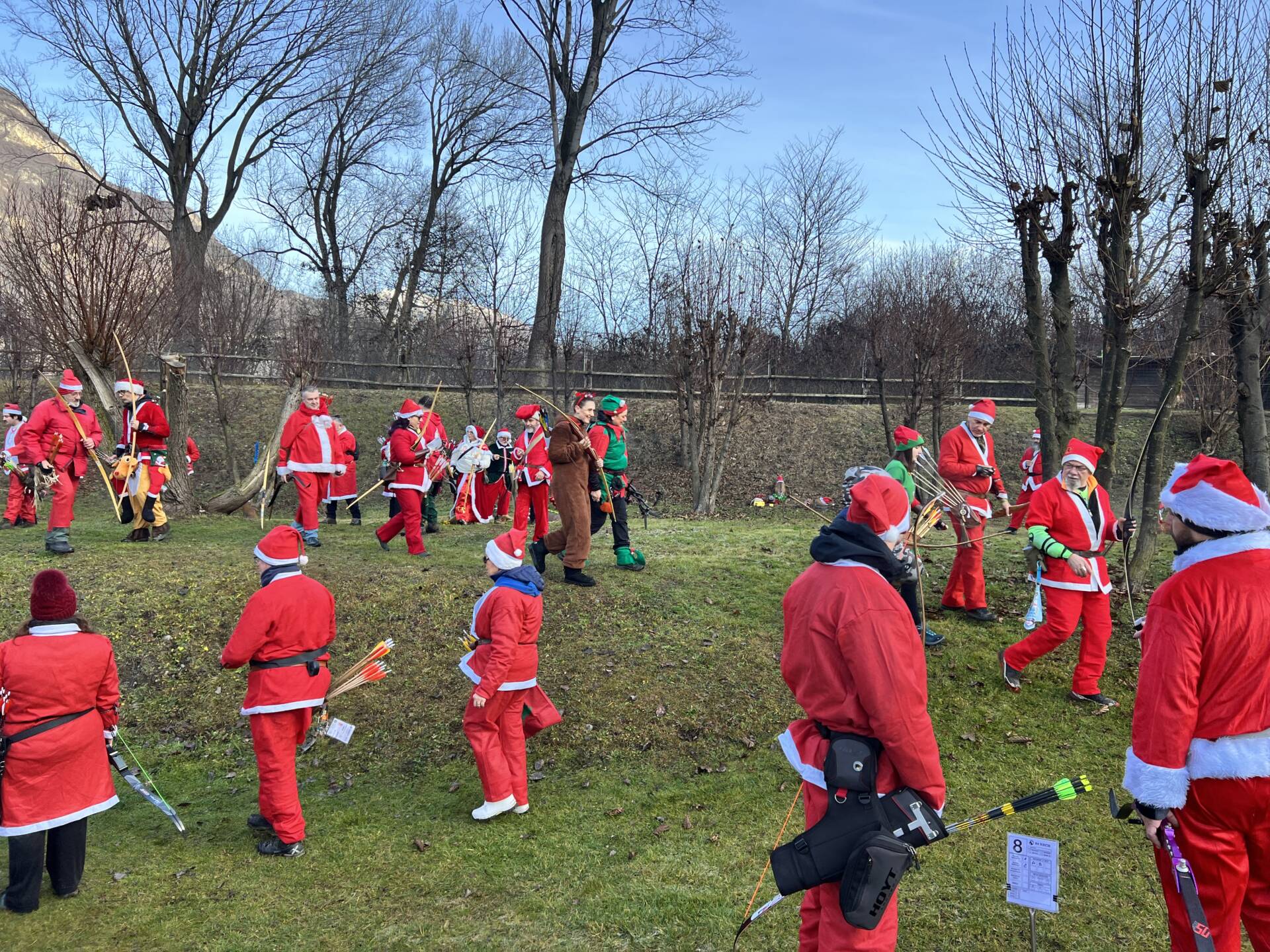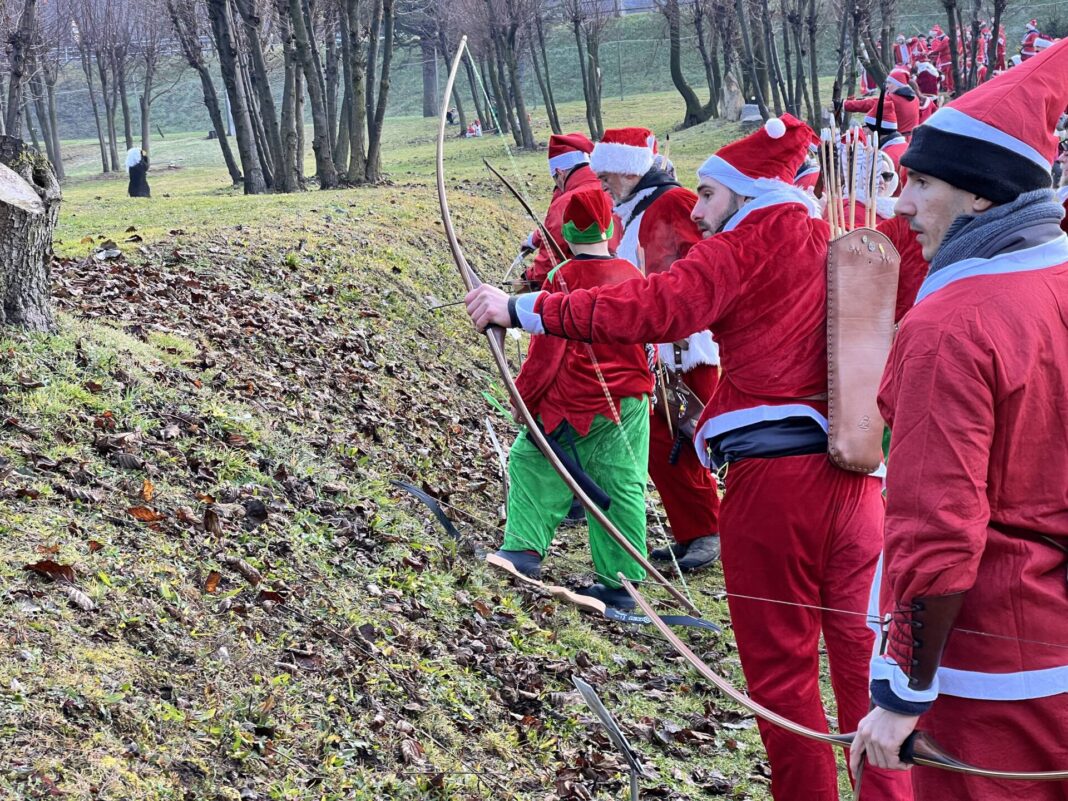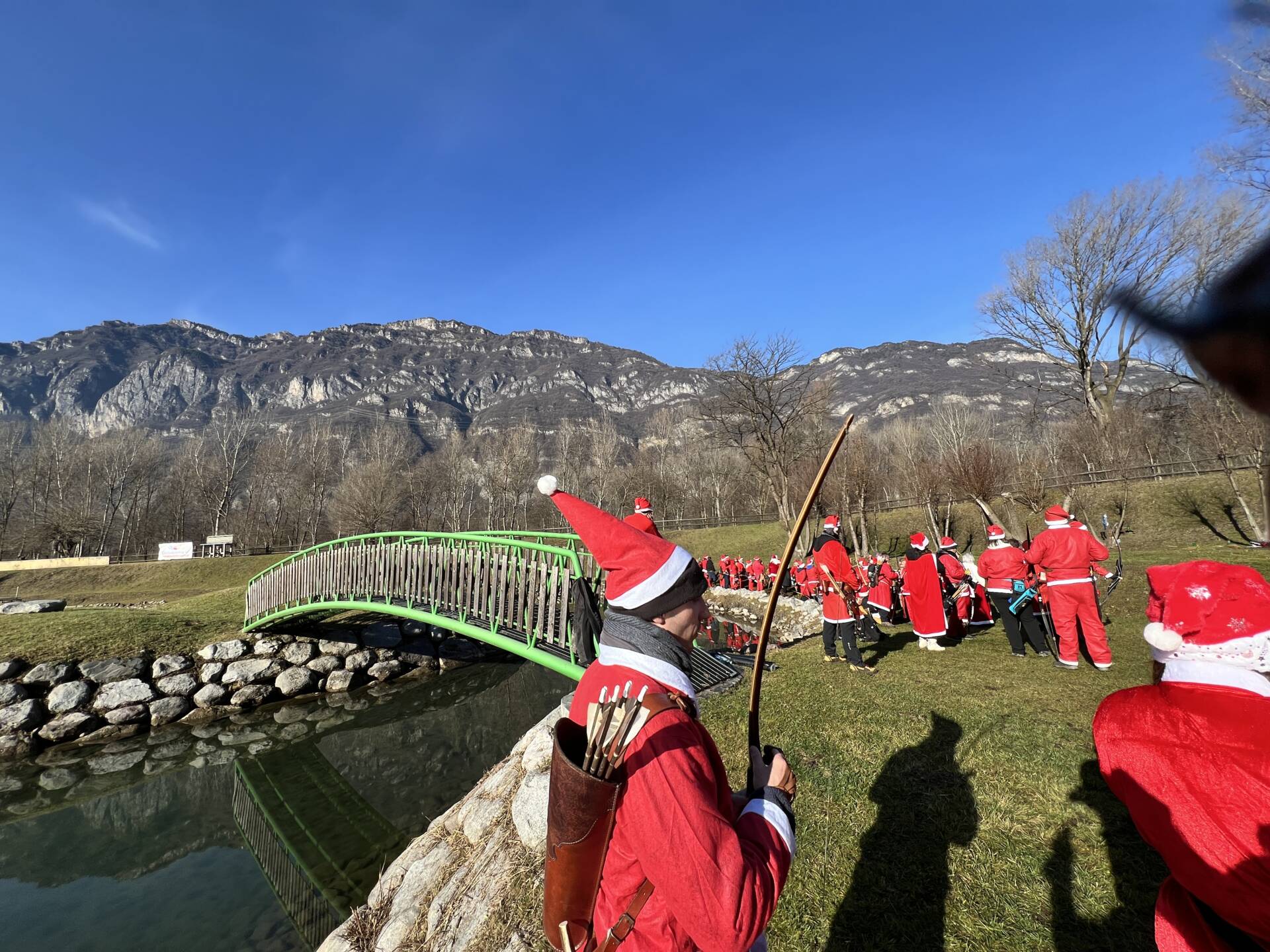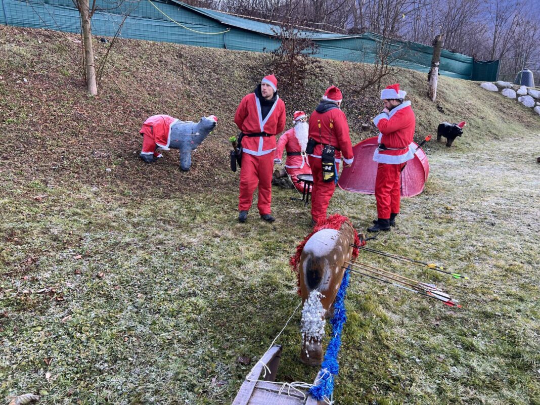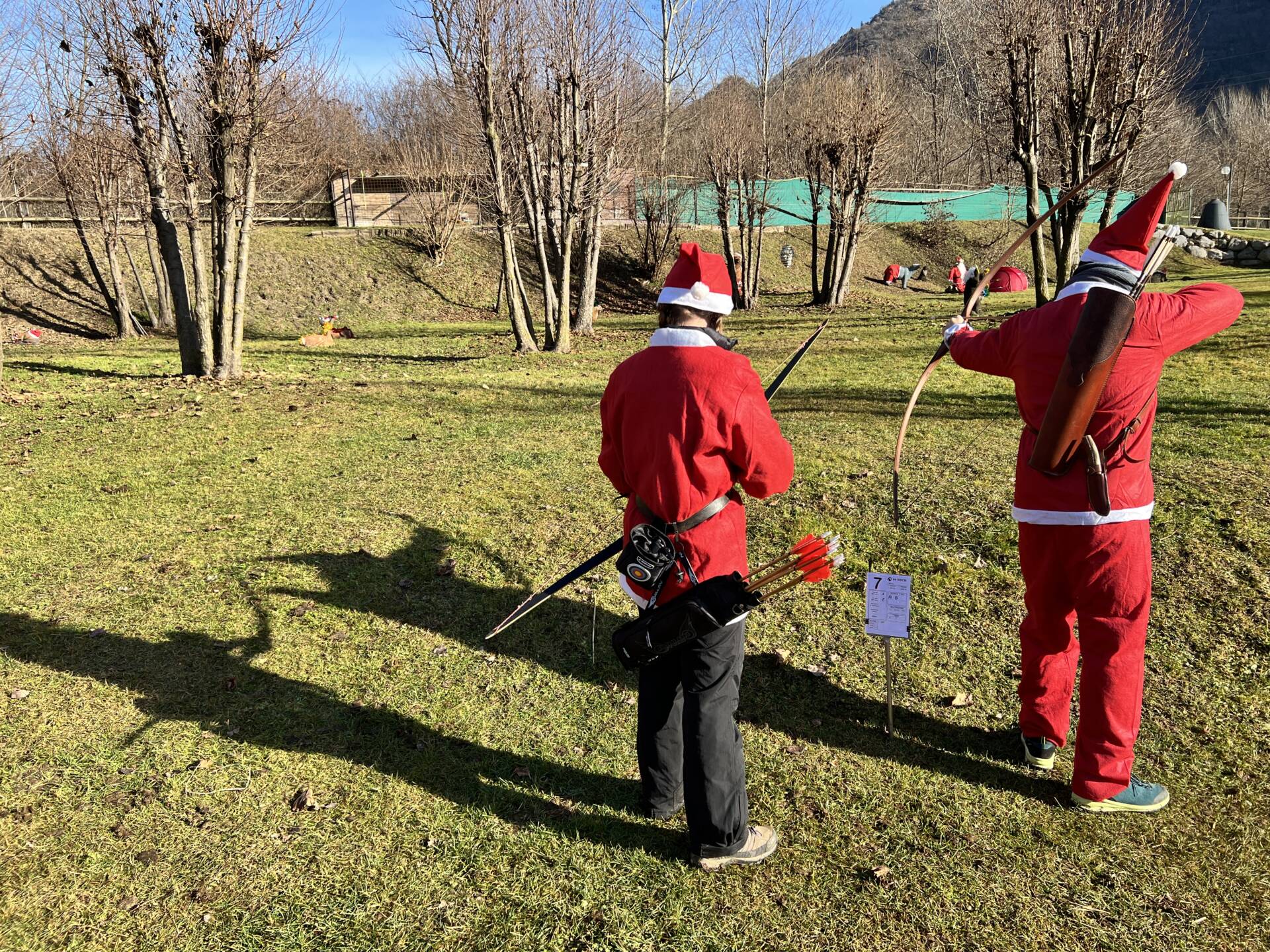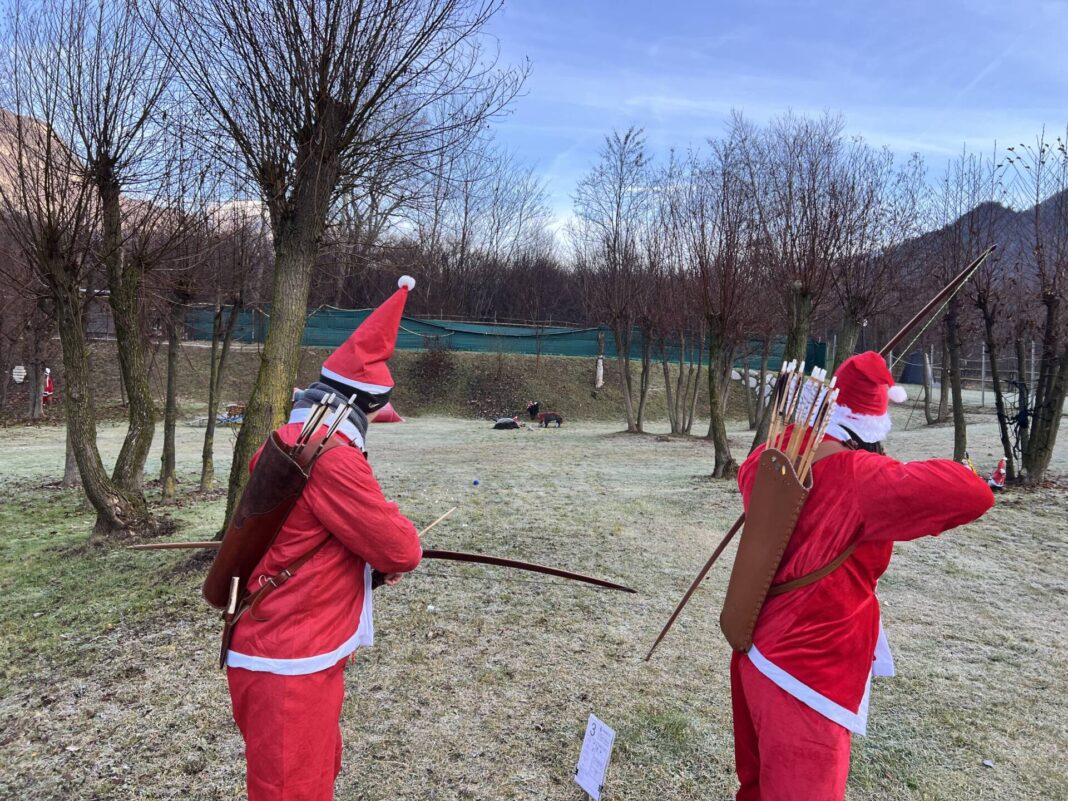 Una bella giornata vestiti da Babbo Natale a tirar frecce attorno al laghetto.
