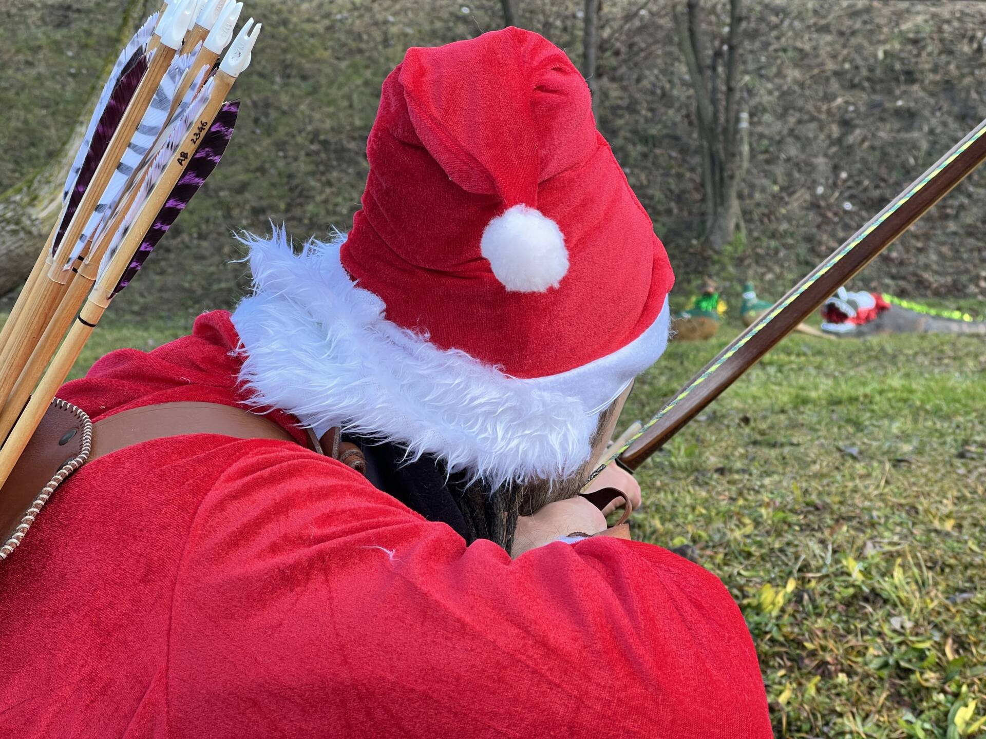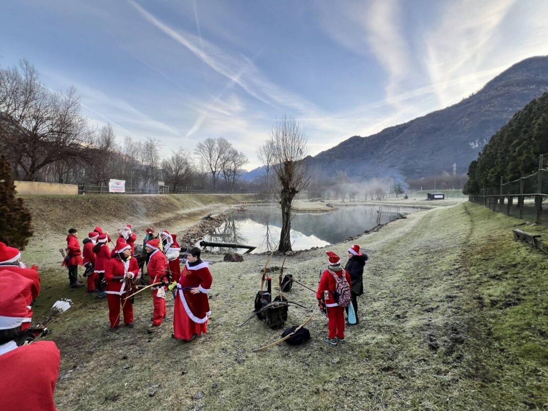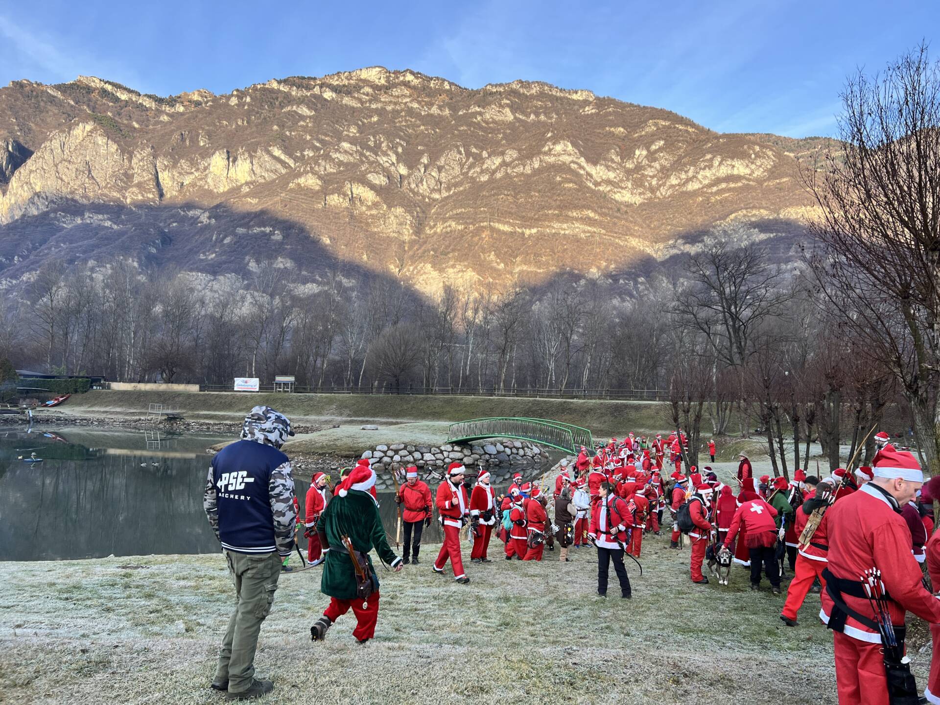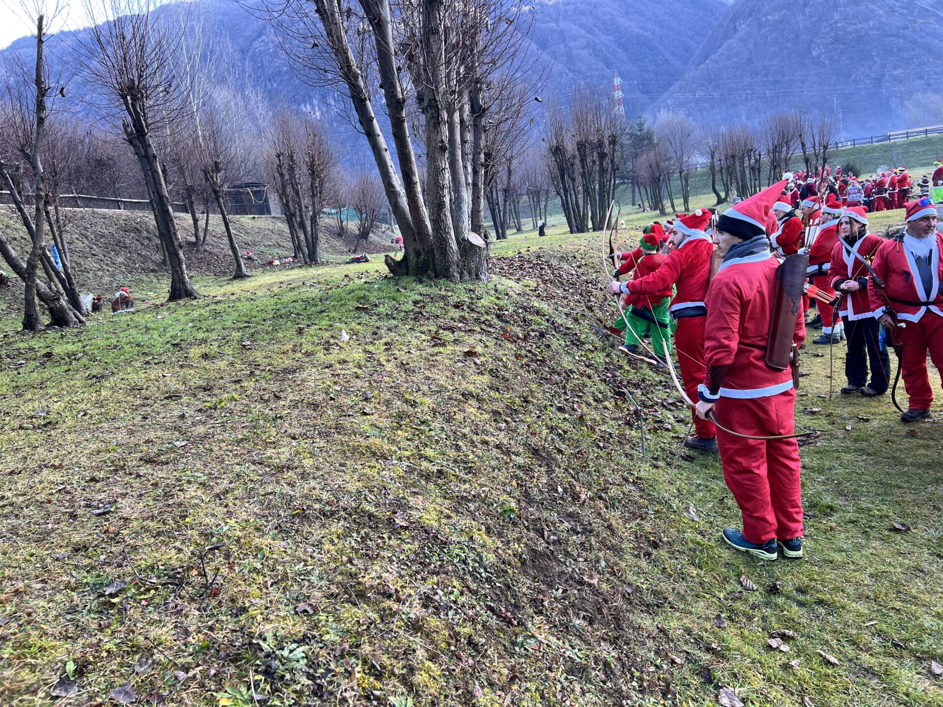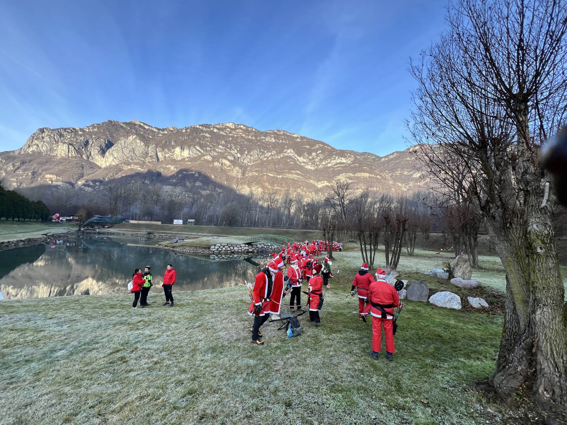 Una bella giornata vestiti da Babbo Natale a tirar frecce attorno al laghetto.