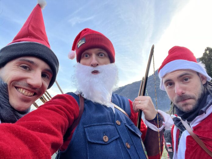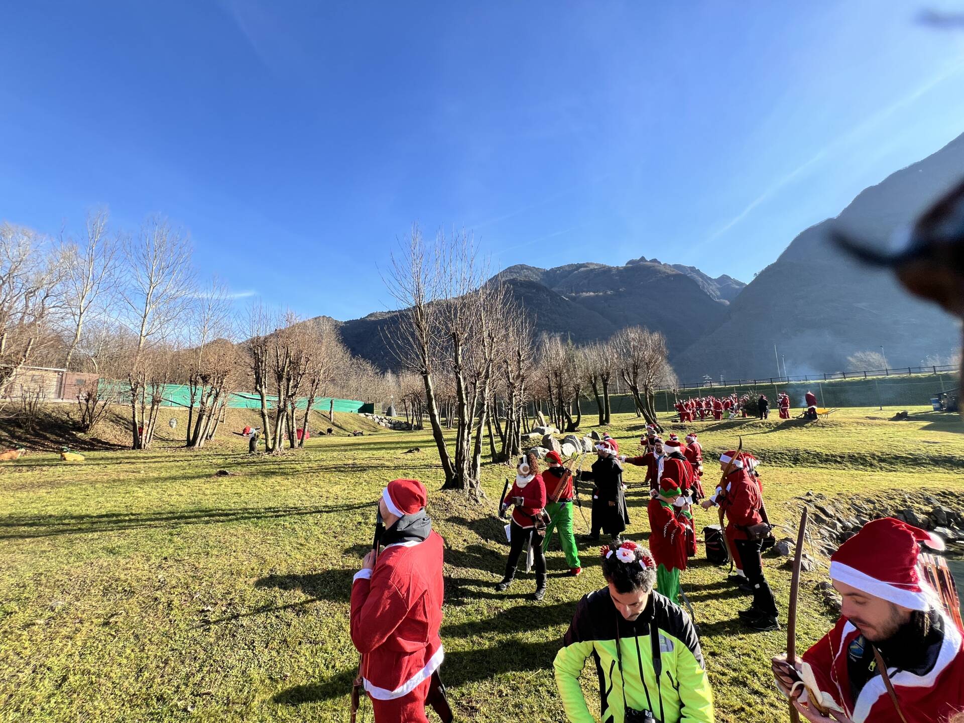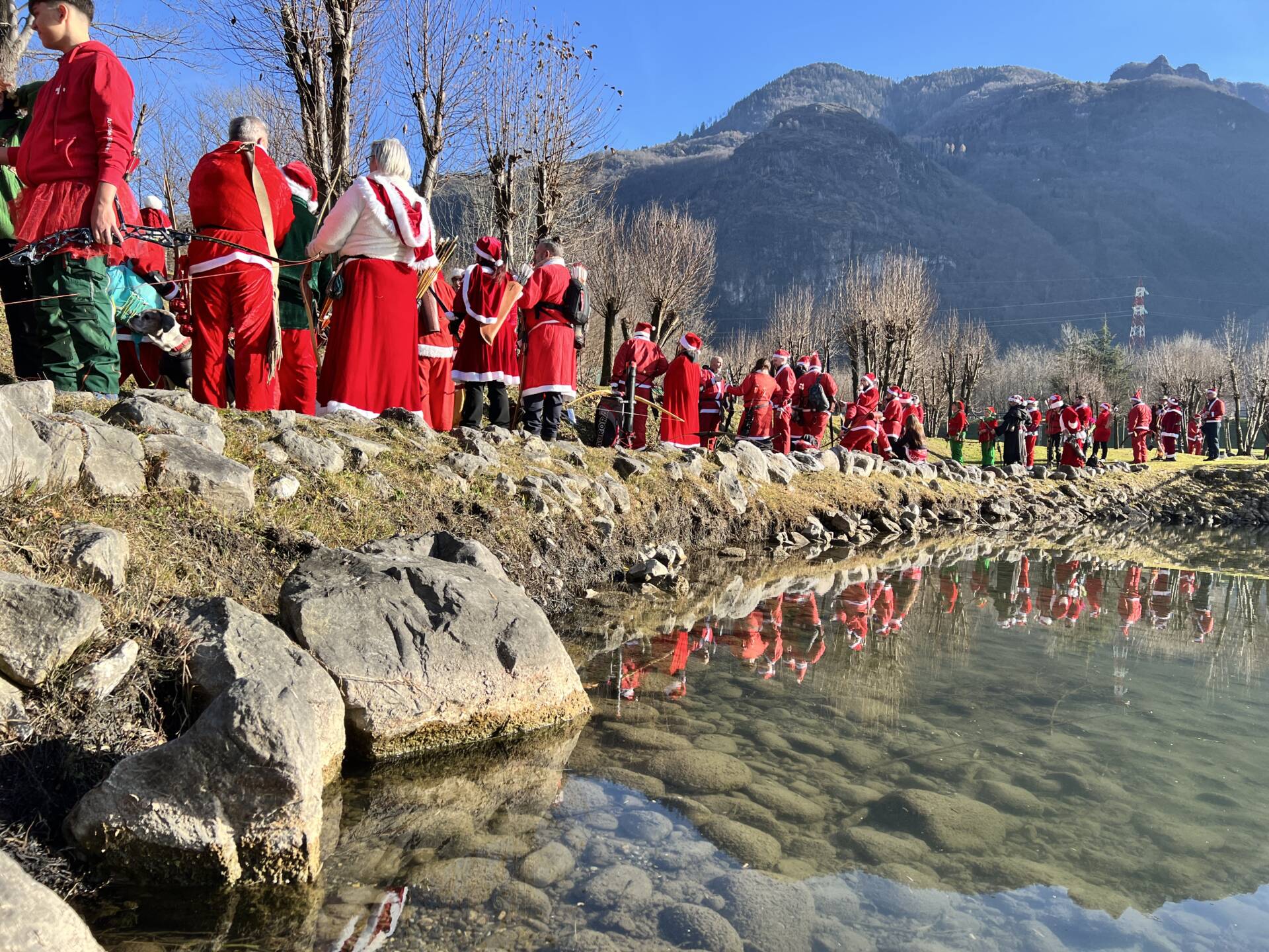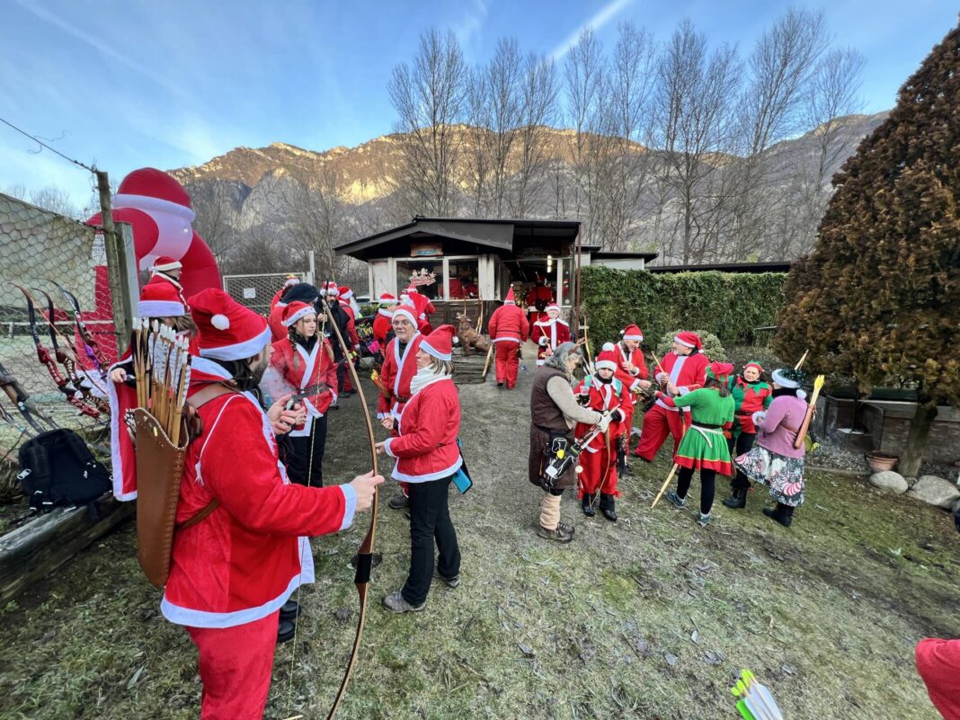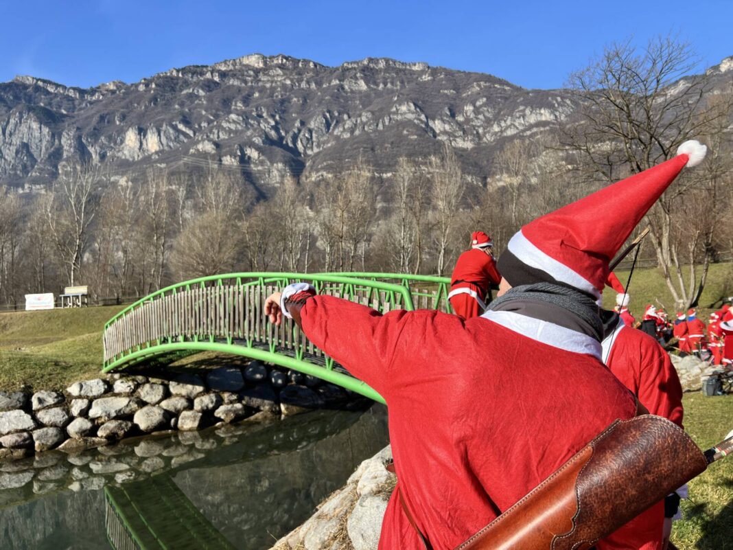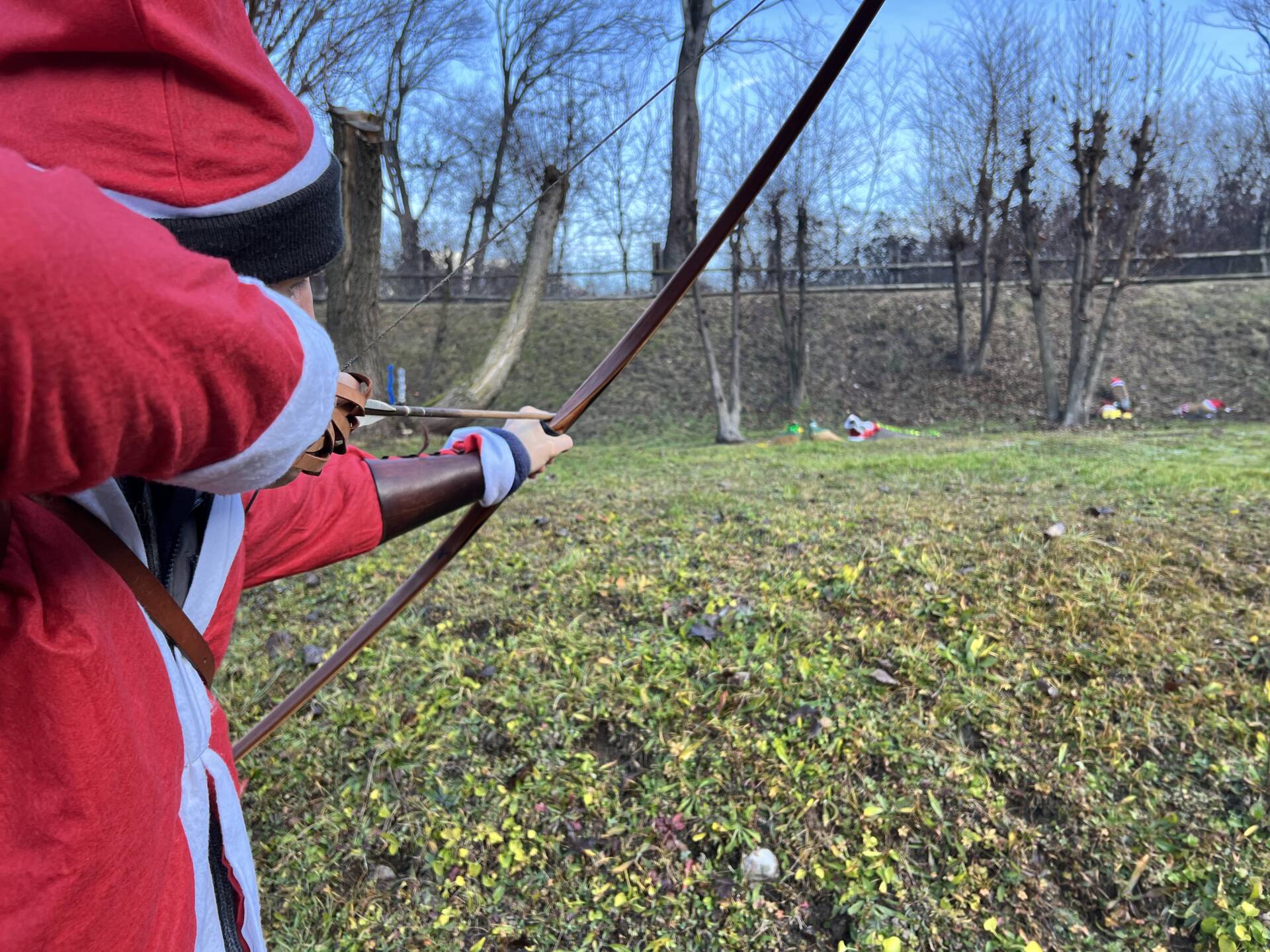 Una bella giornata vestiti da Babbo Natale a tirar frecce attorno al laghetto.