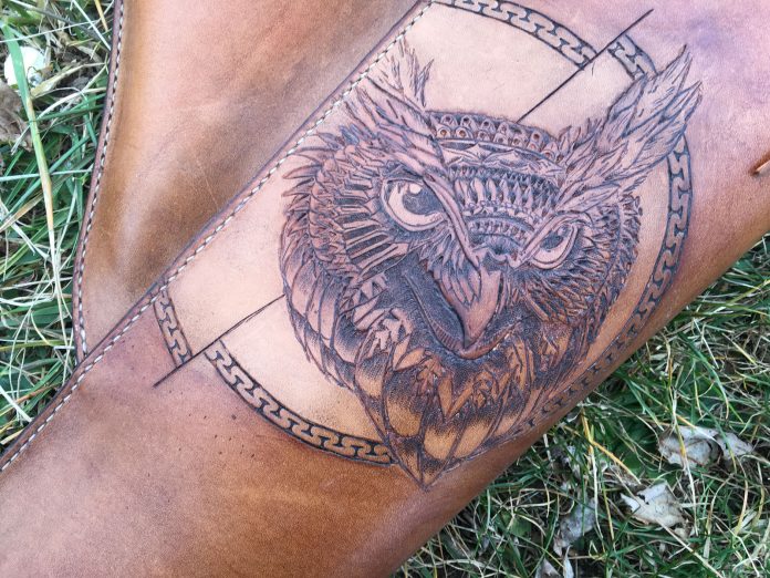 Progettazione, taglio pelle, colorazione, decorazione, cucitura e rifinitura a mano.