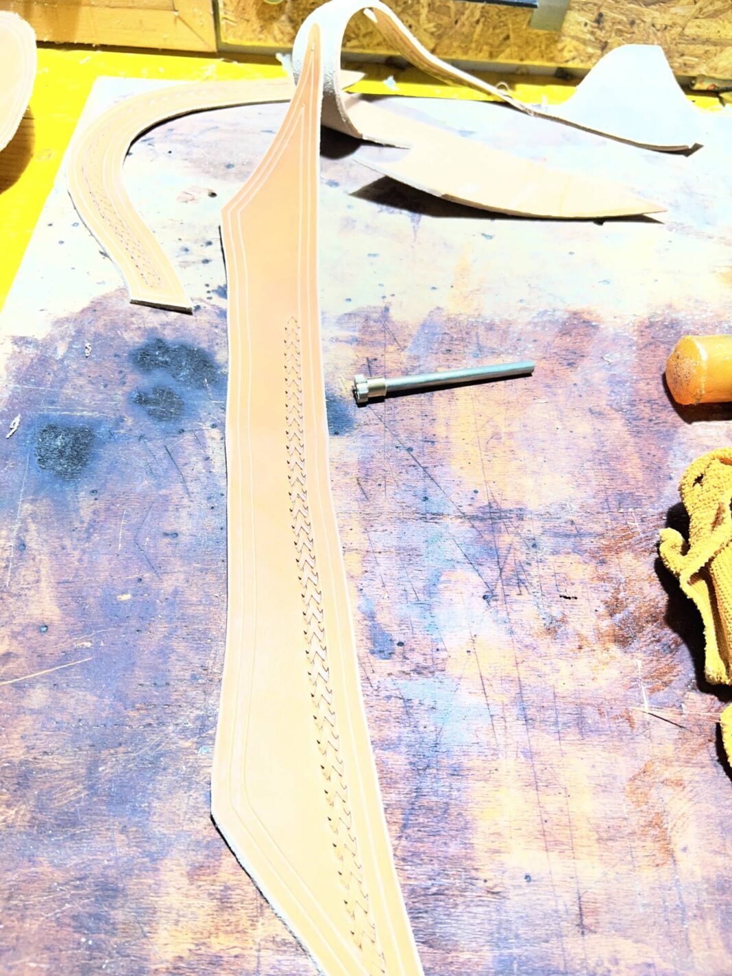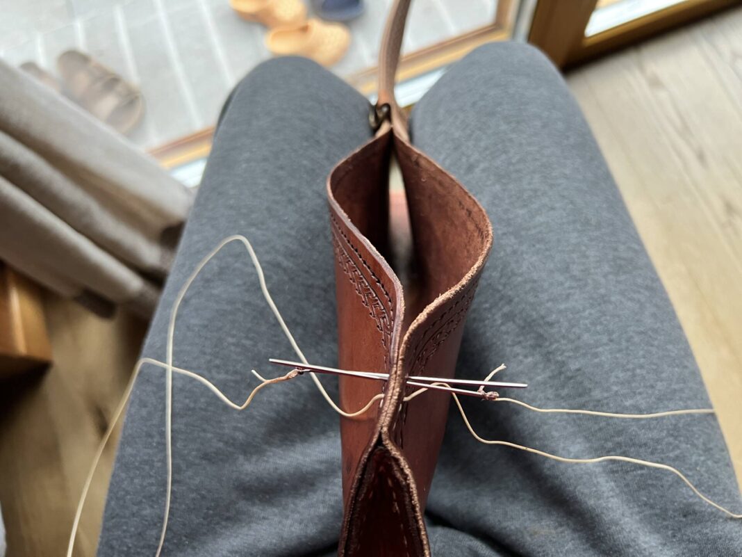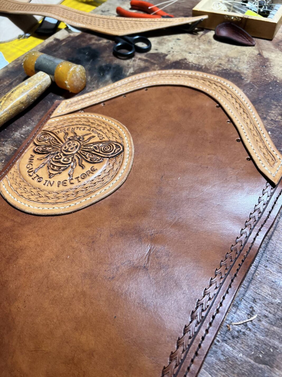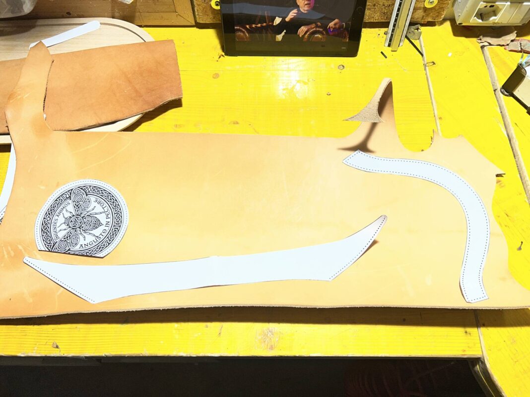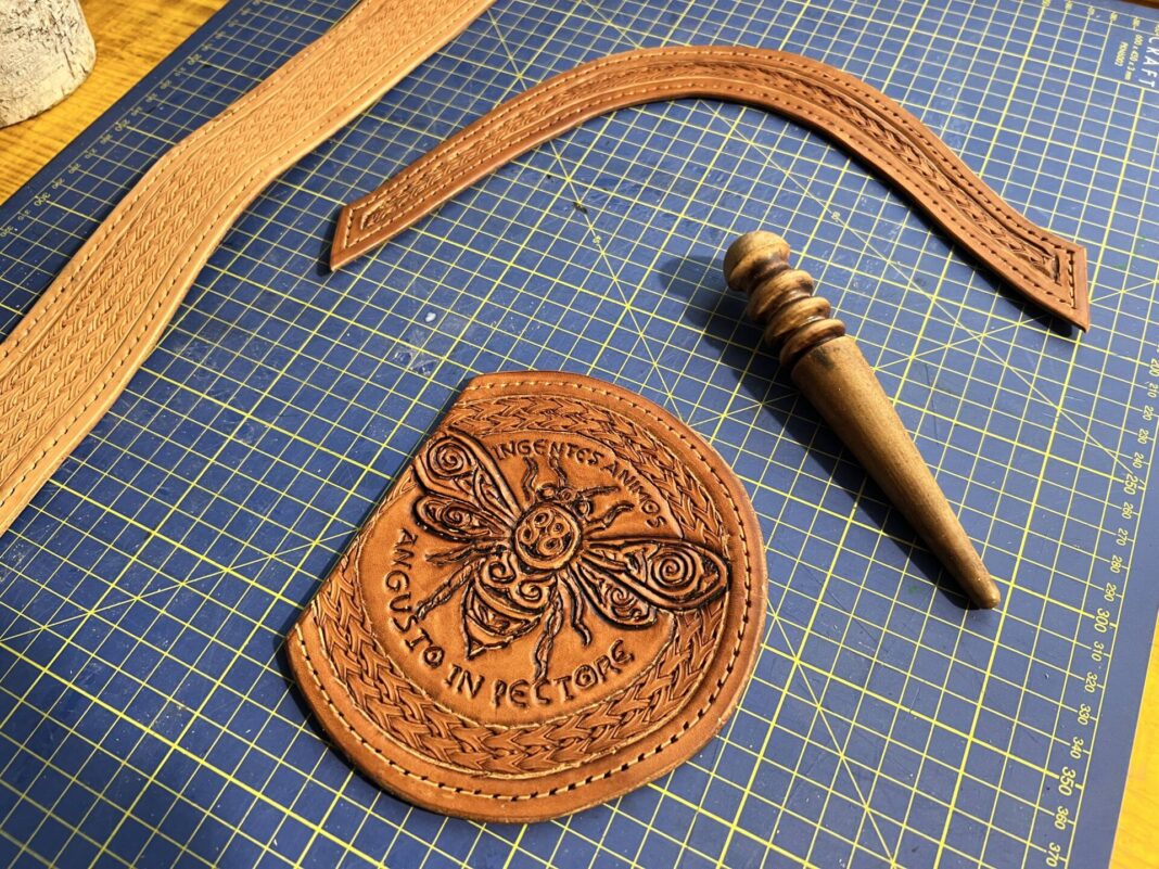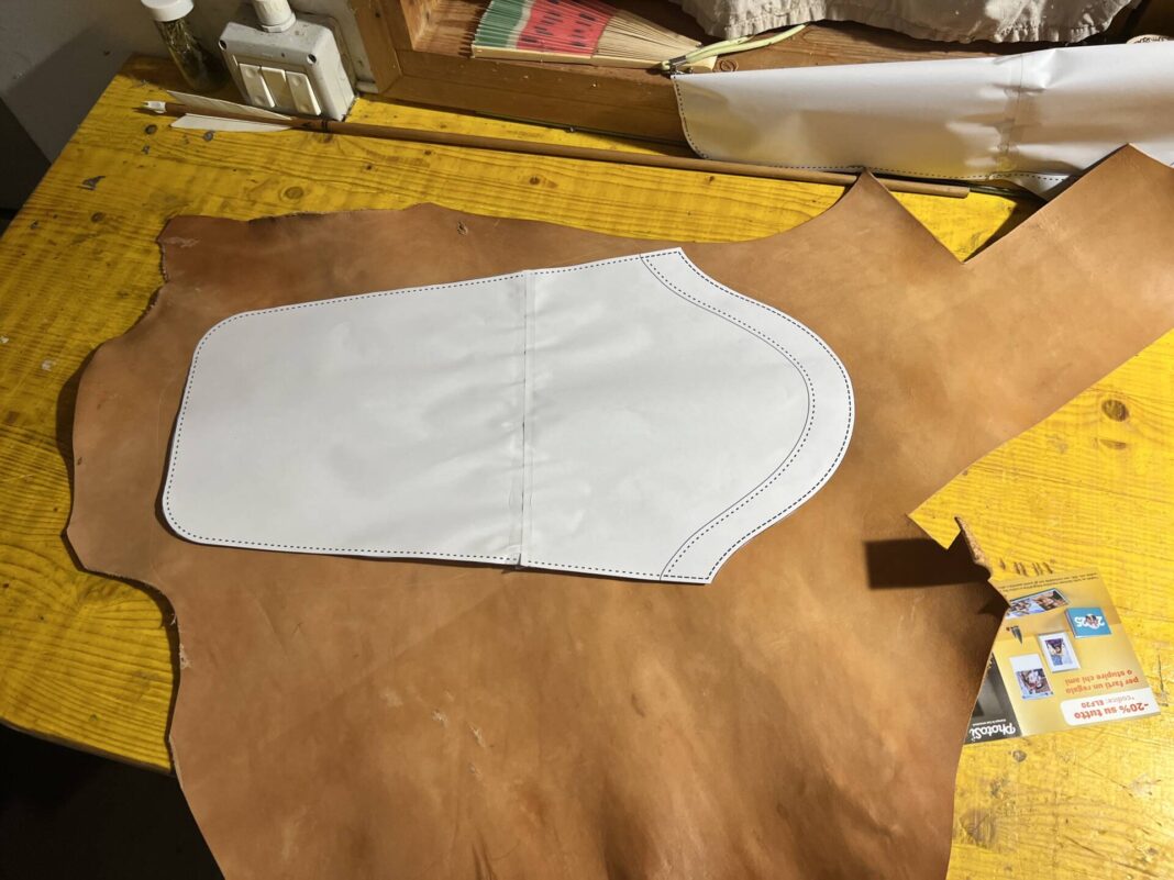 Progettazione, taglio pelle, colorazione, decorazione,  cucitura e rifinitura a mano.