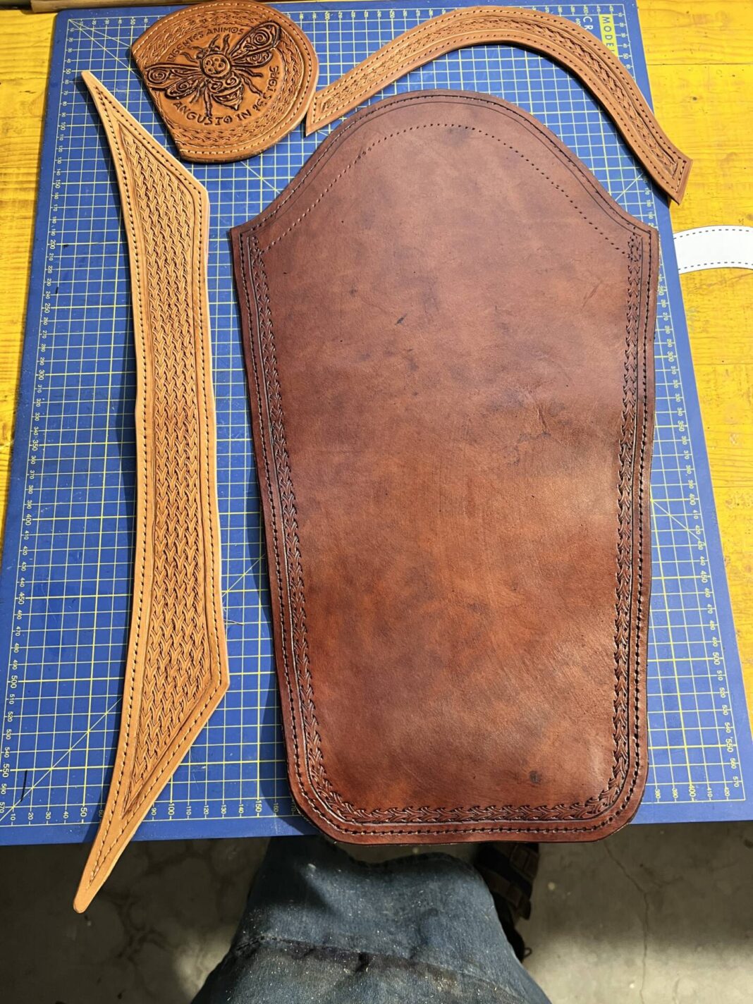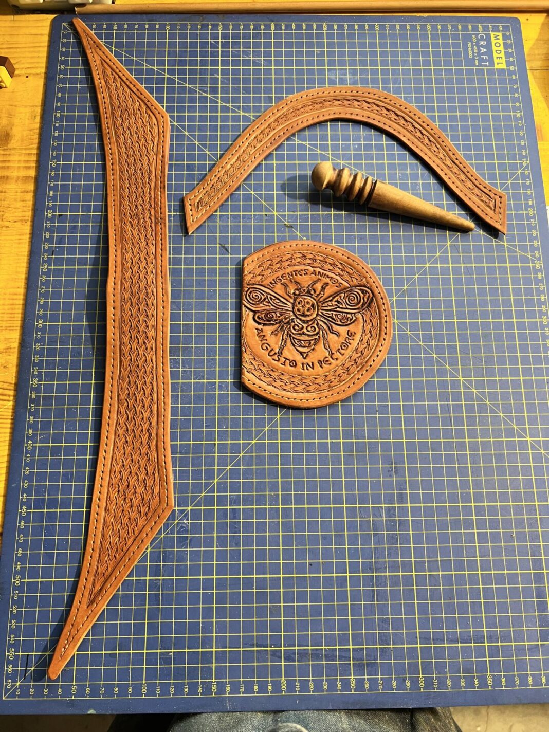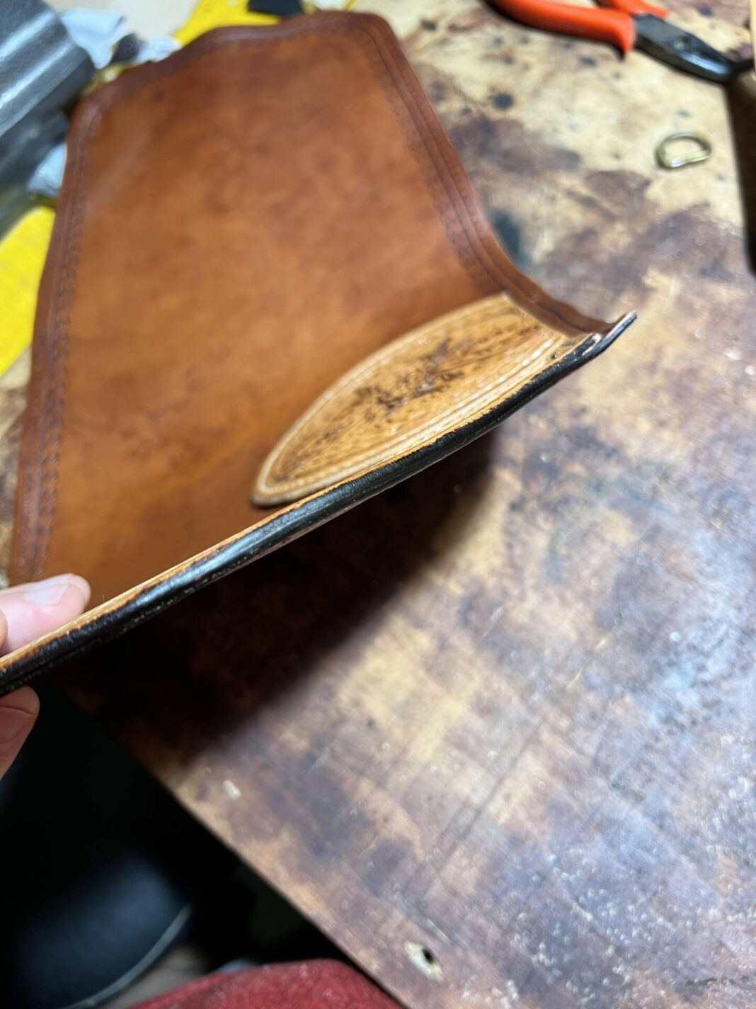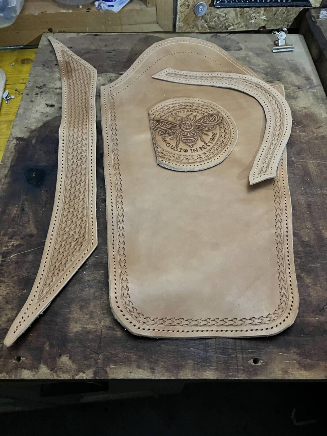 Progettazione, taglio pelle, colorazione, decorazione,  cucitura e rifinitura a mano.