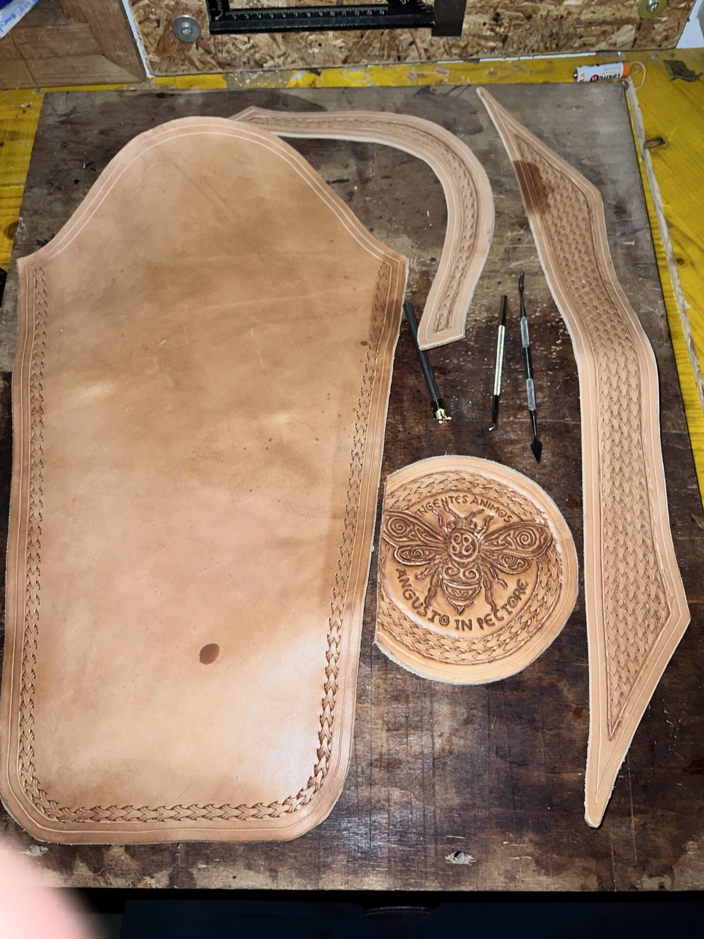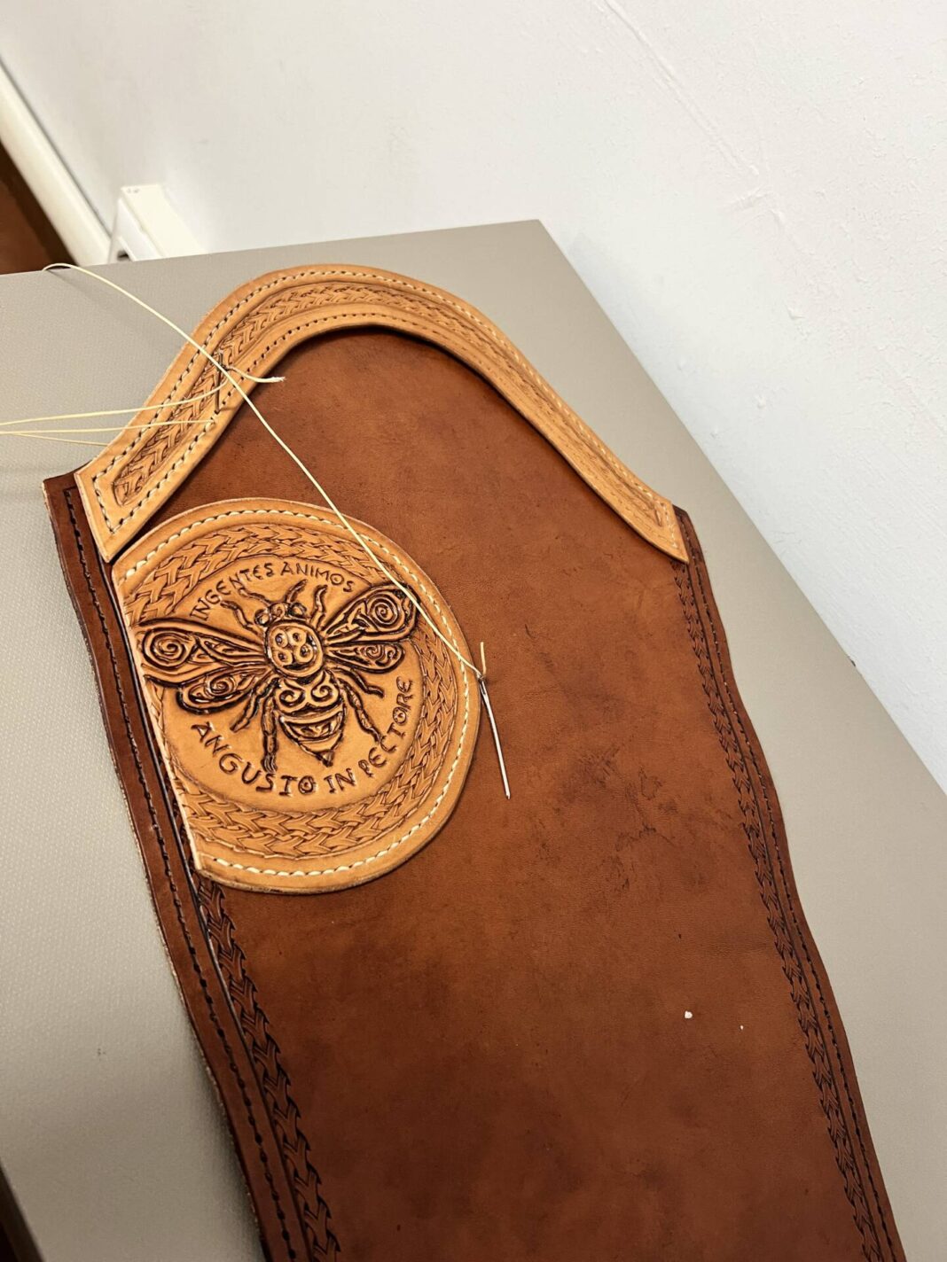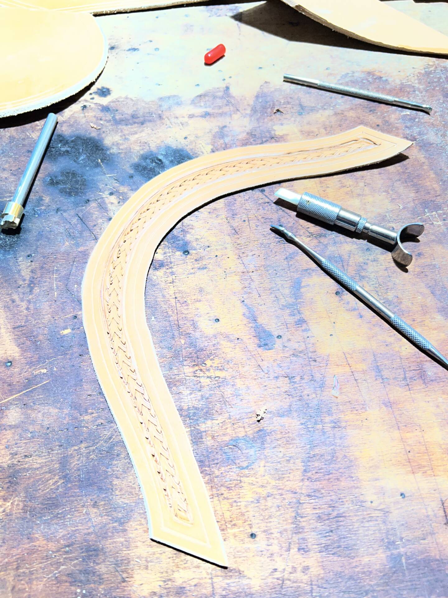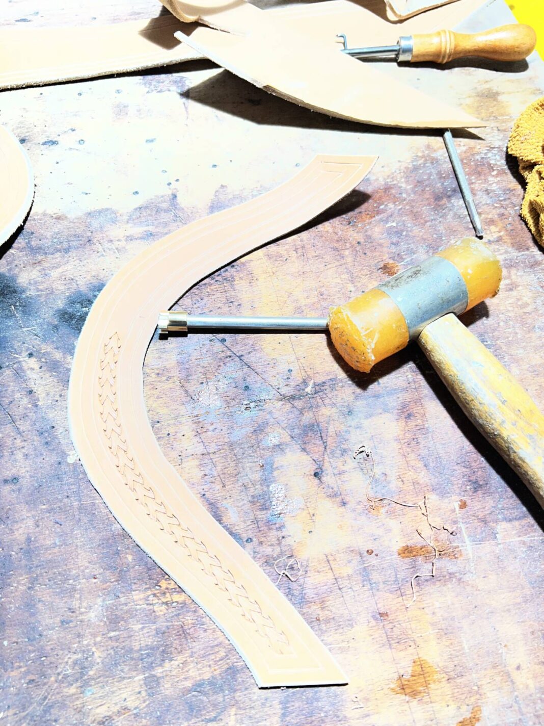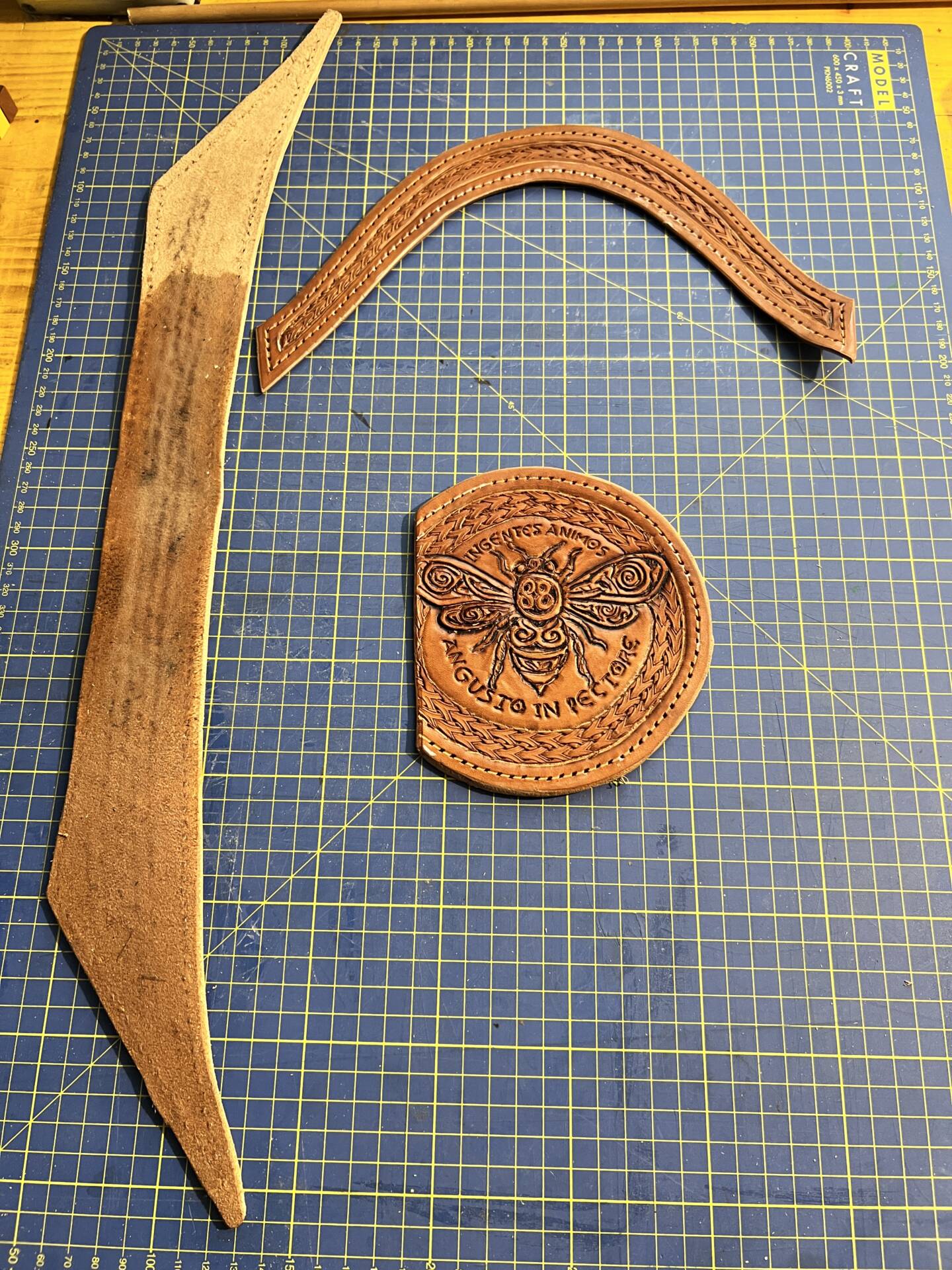 Progettazione, taglio pelle, colorazione, decorazione,  cucitura e rifinitura a mano.