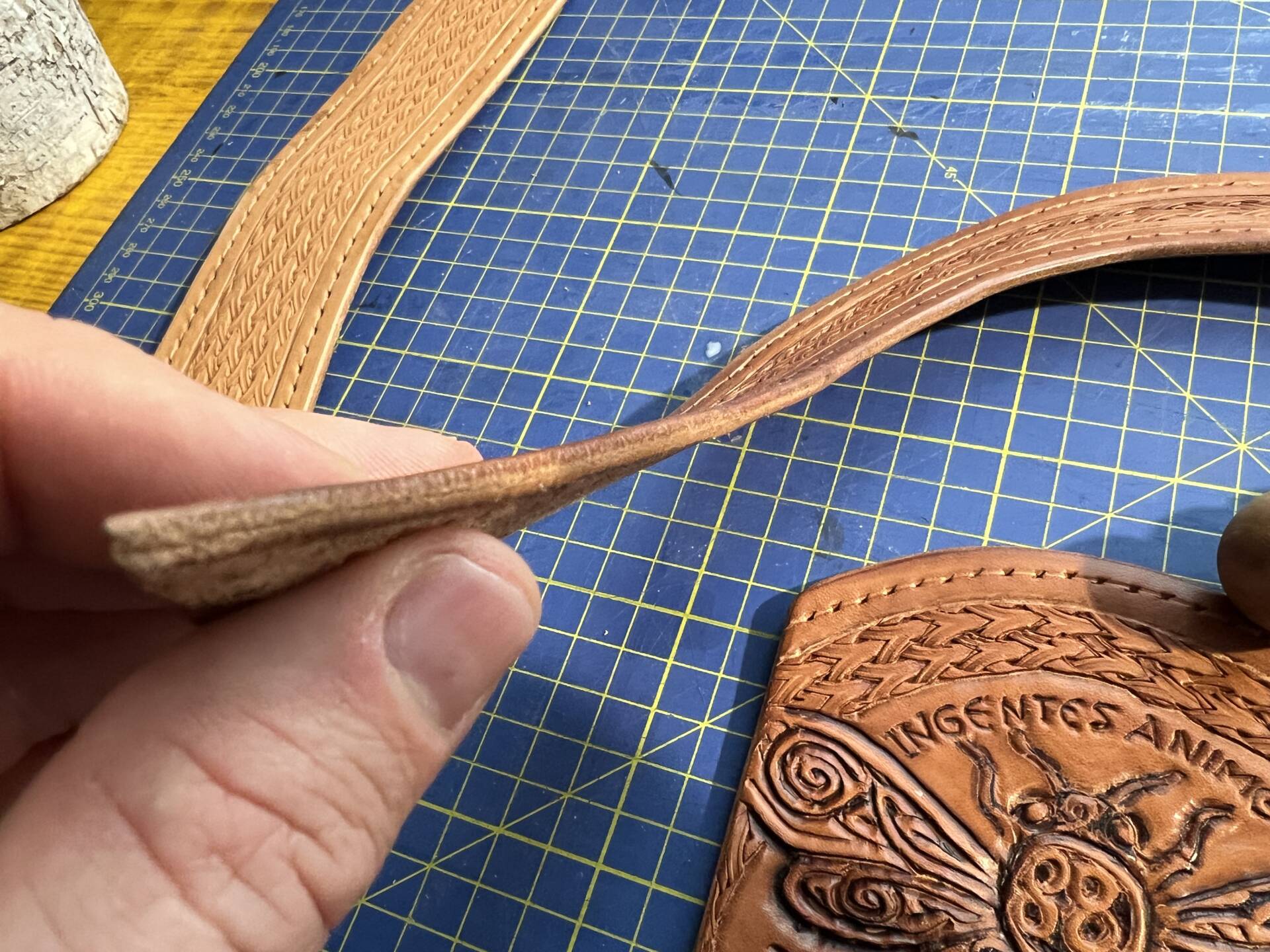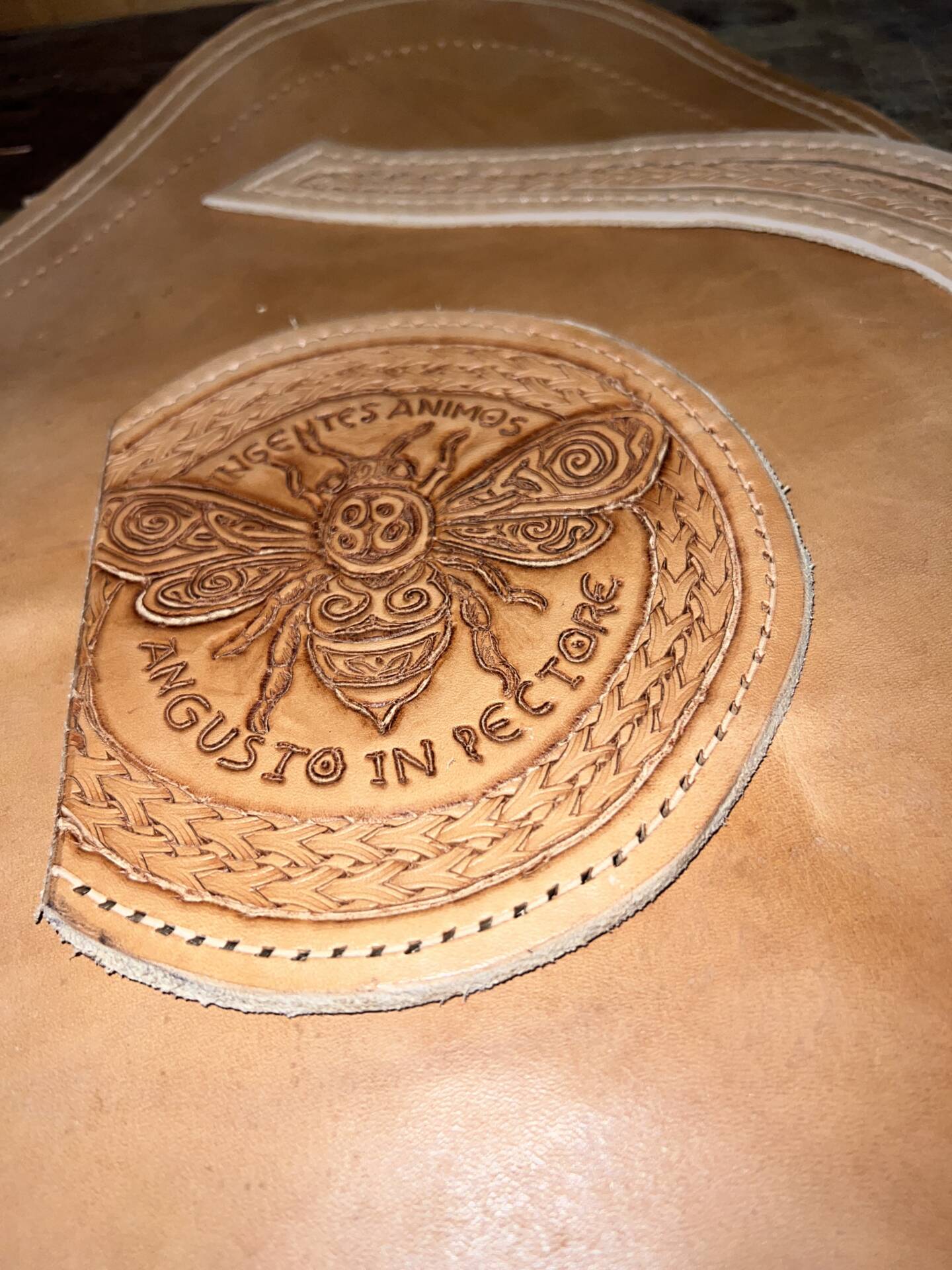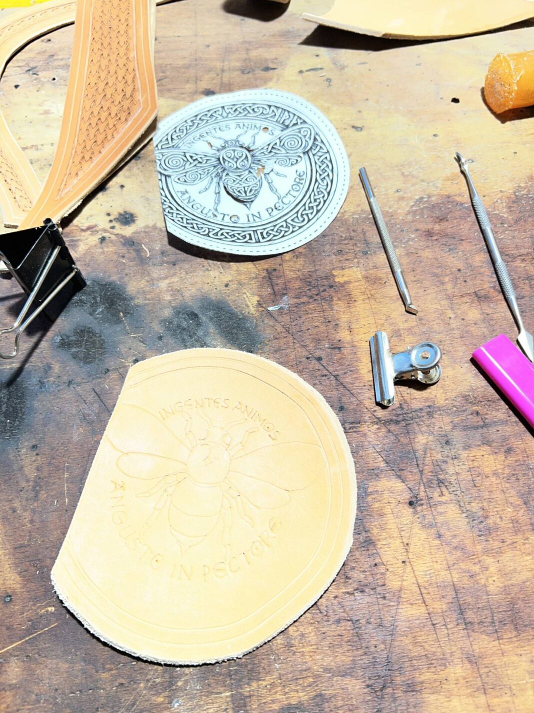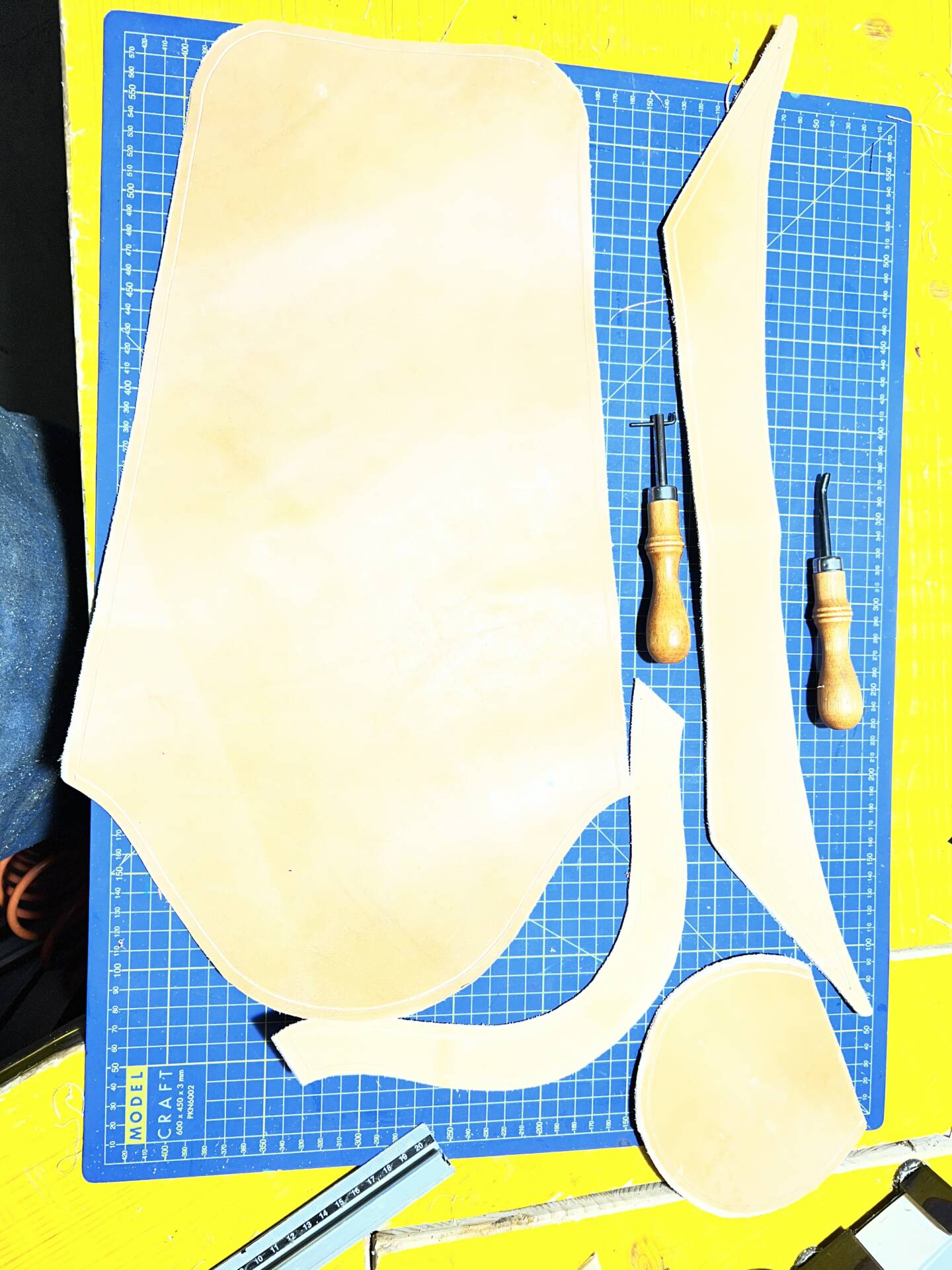 Progettazione, taglio pelle, colorazione, decorazione,  cucitura e rifinitura a mano.