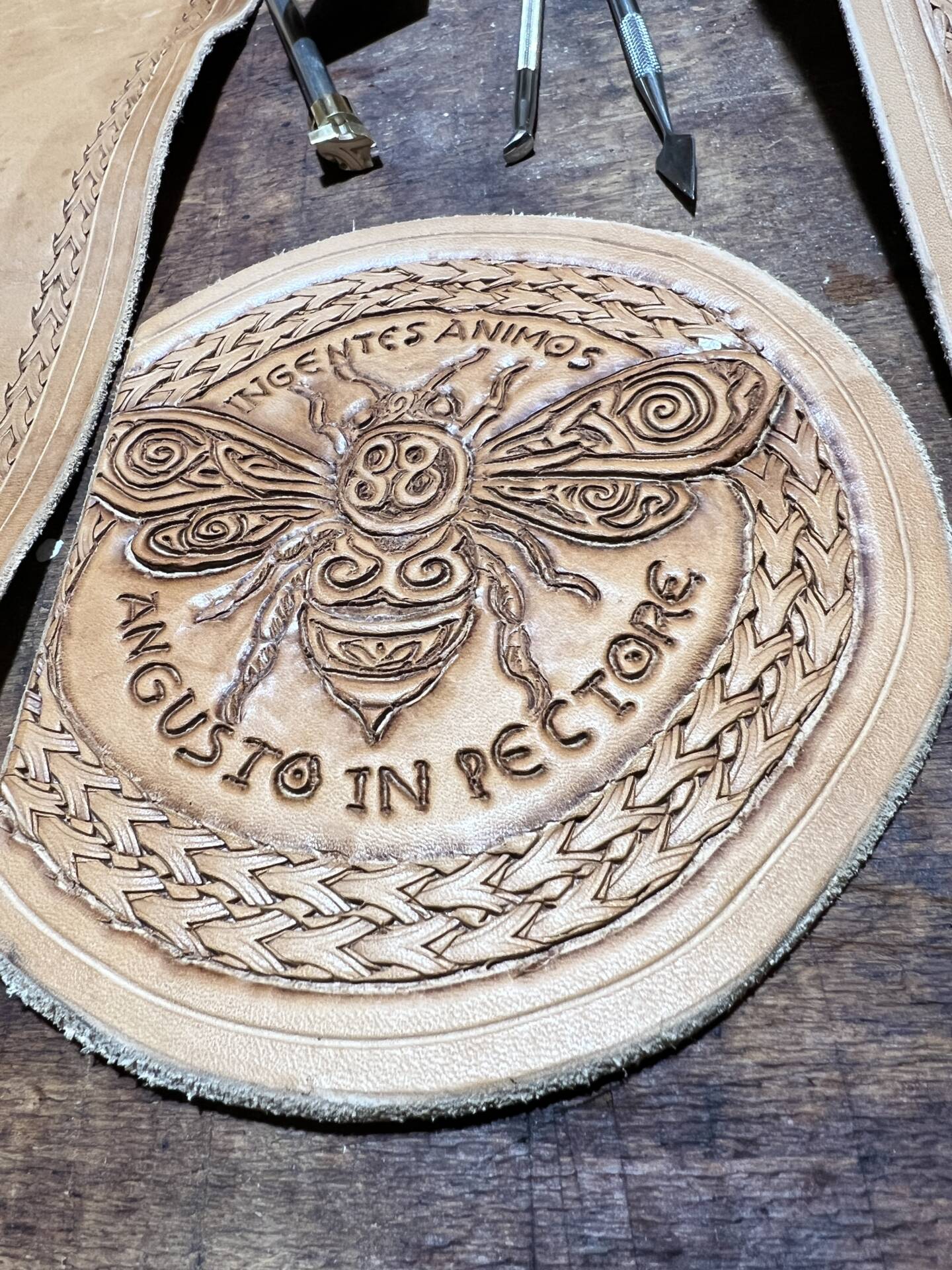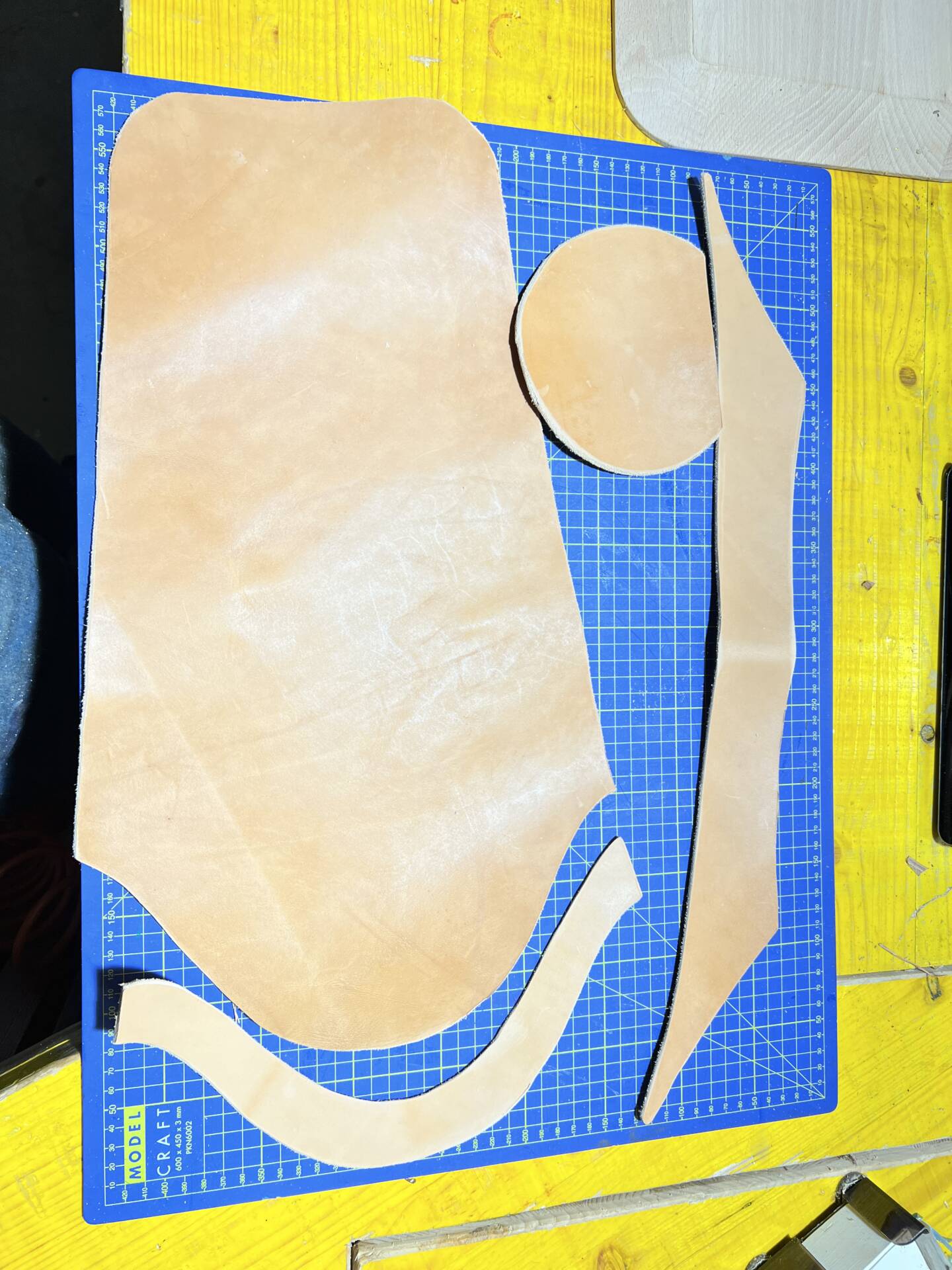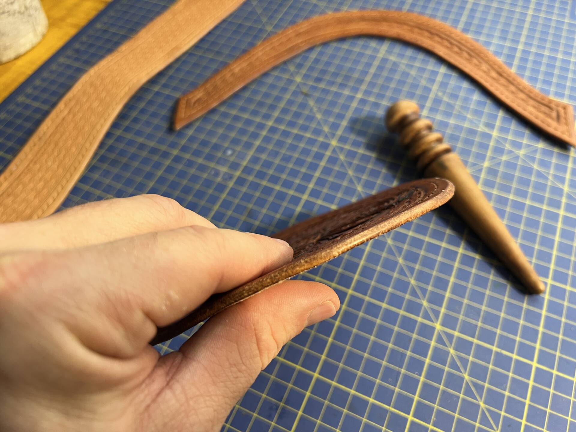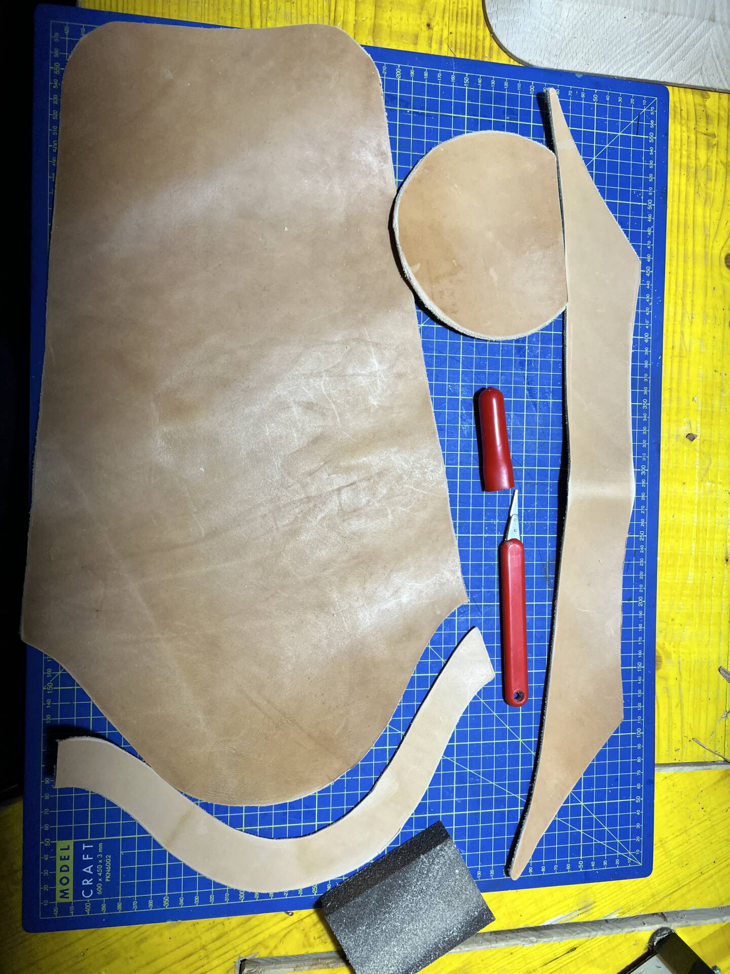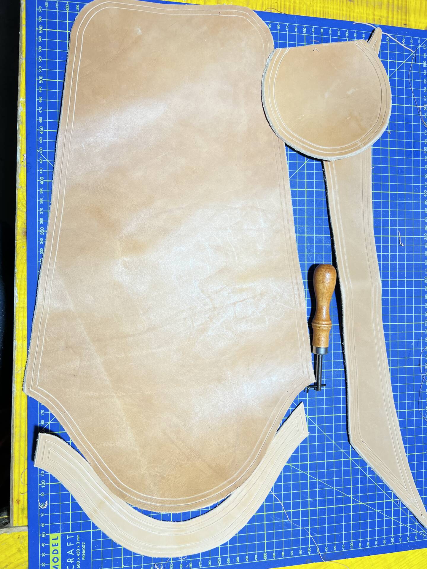 Progettazione, taglio pelle, colorazione, decorazione,  cucitura e rifinitura a mano.