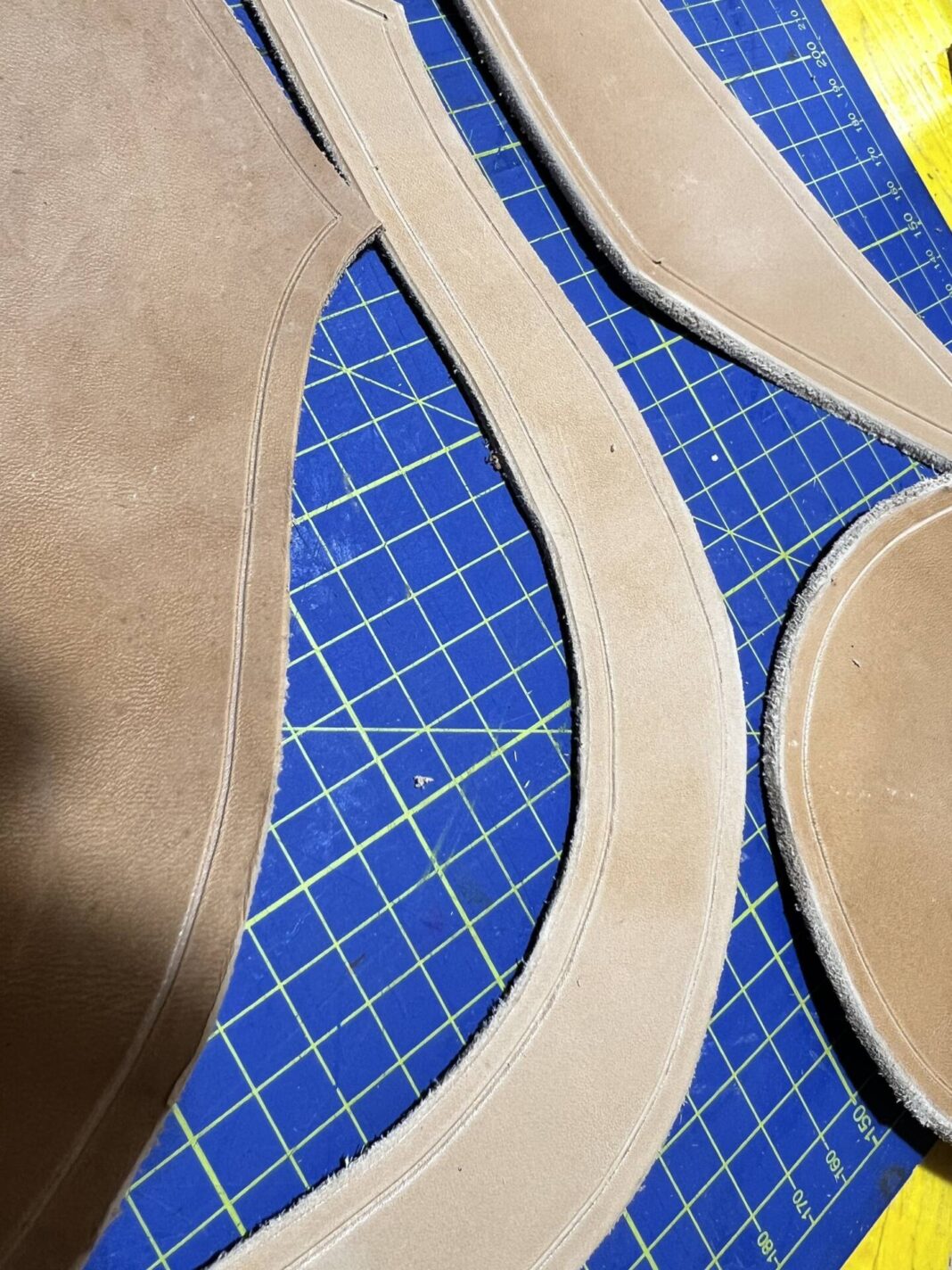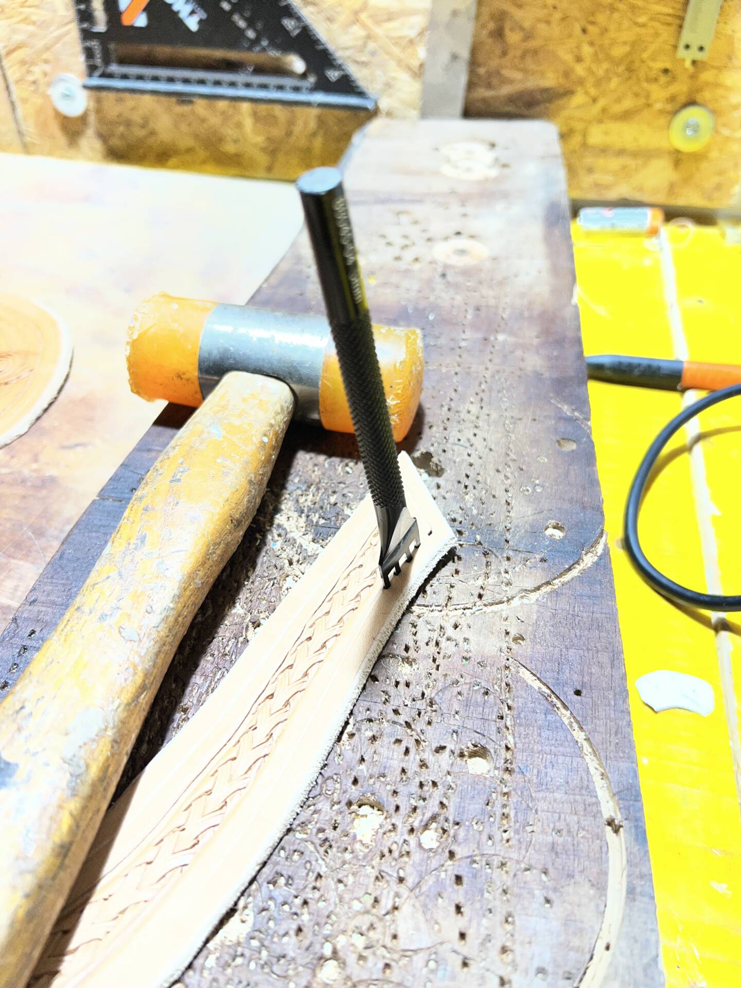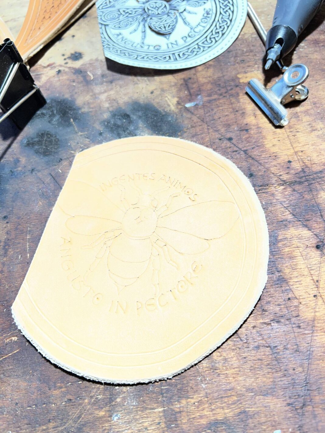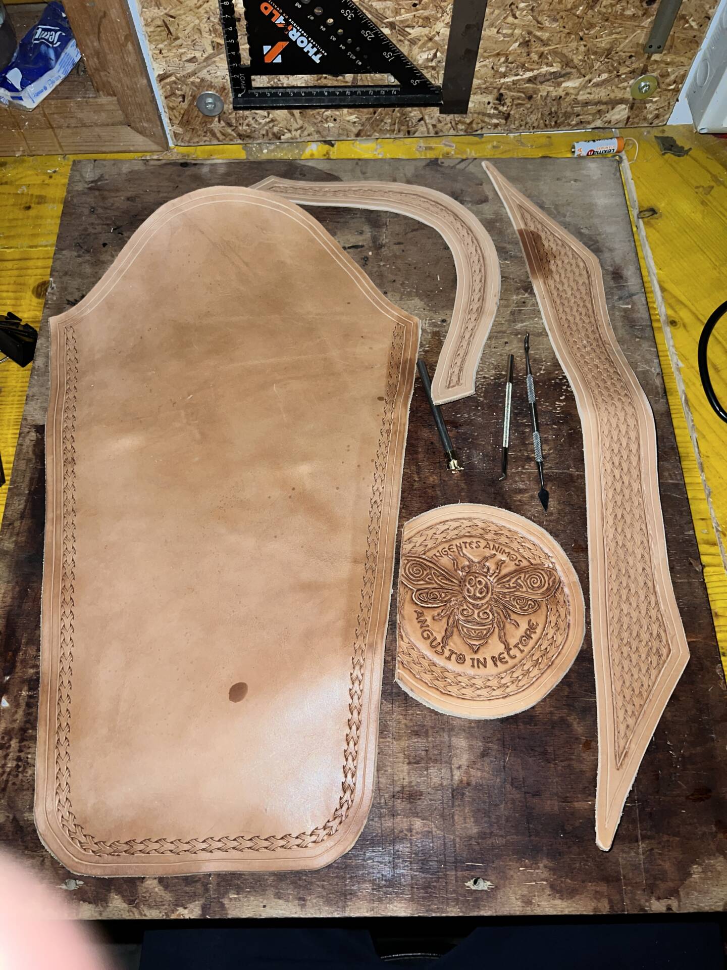 Progettazione, taglio pelle, colorazione, decorazione,  cucitura e rifinitura a mano.