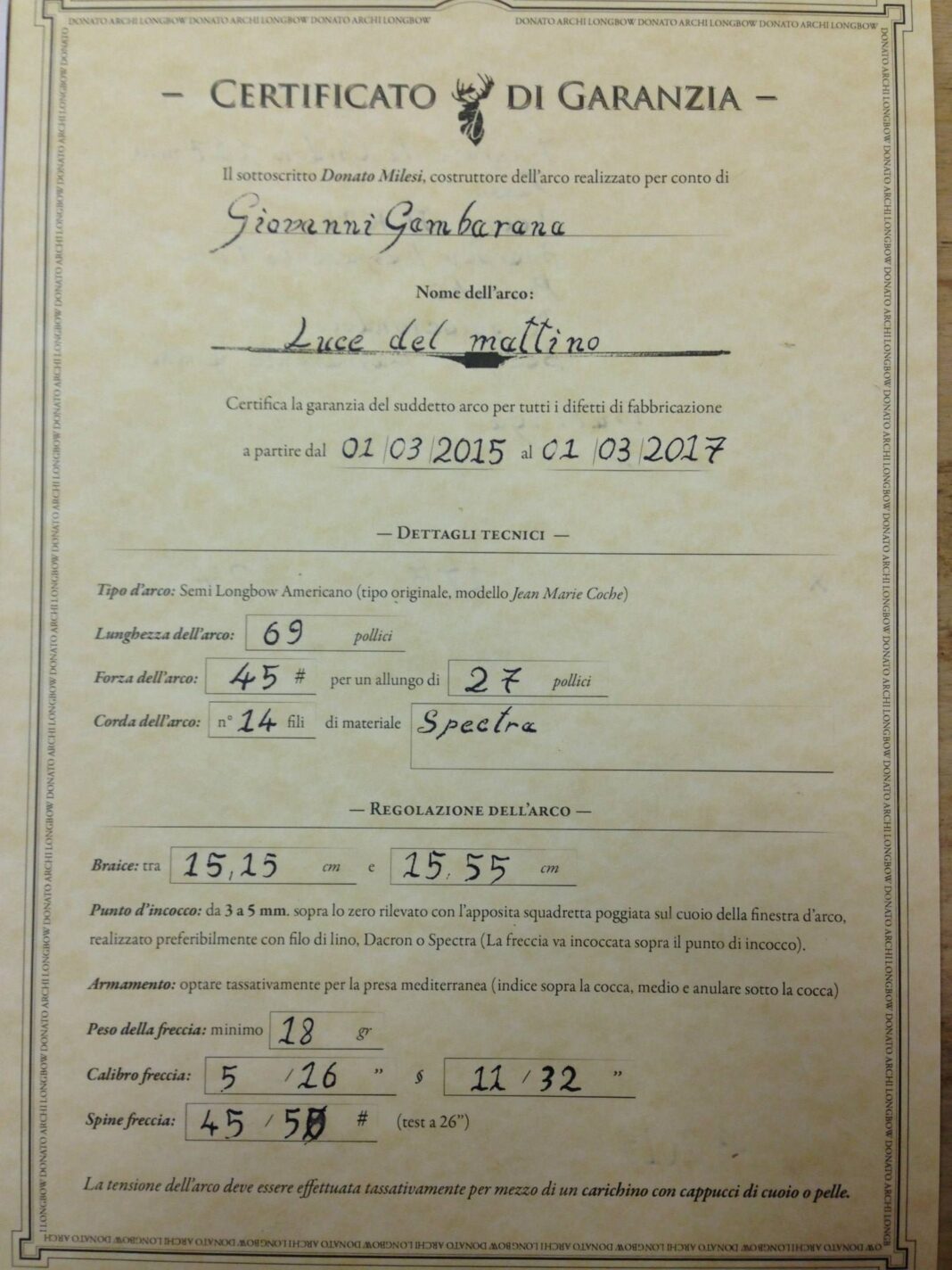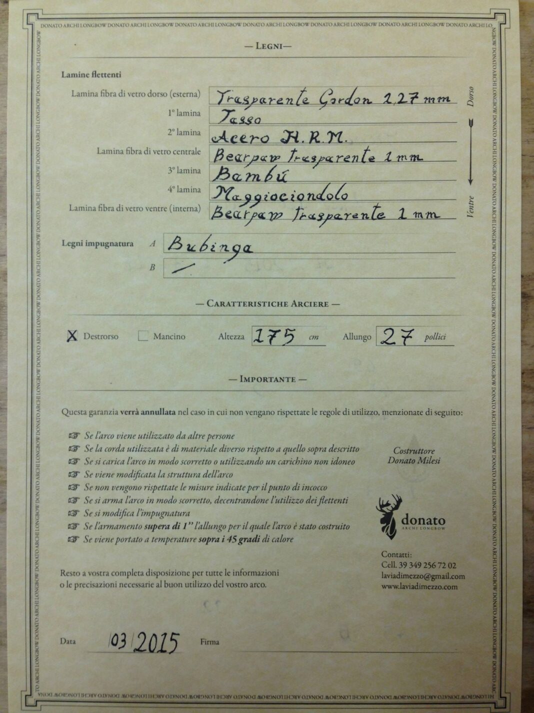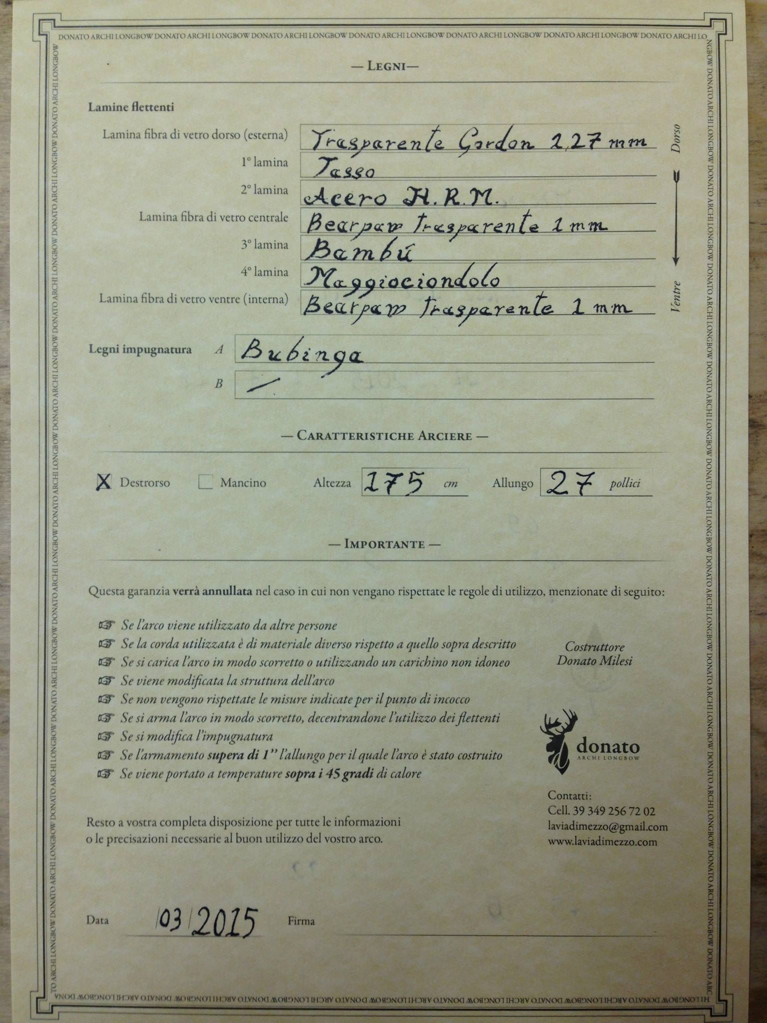 L’arco è stato fornito con garanzia per tutti i difetti di fabbricazione per 2 anni.